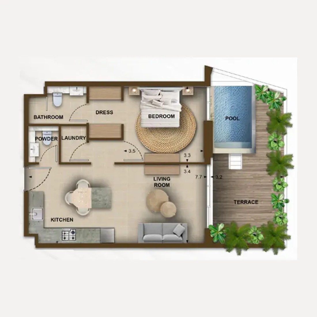 105 Residences by Kamdar is a masterpiece of modern luxury, offering a selection of stunning studio, one-bedroom, and two-bedroom apartments, including exclusive units with private pools