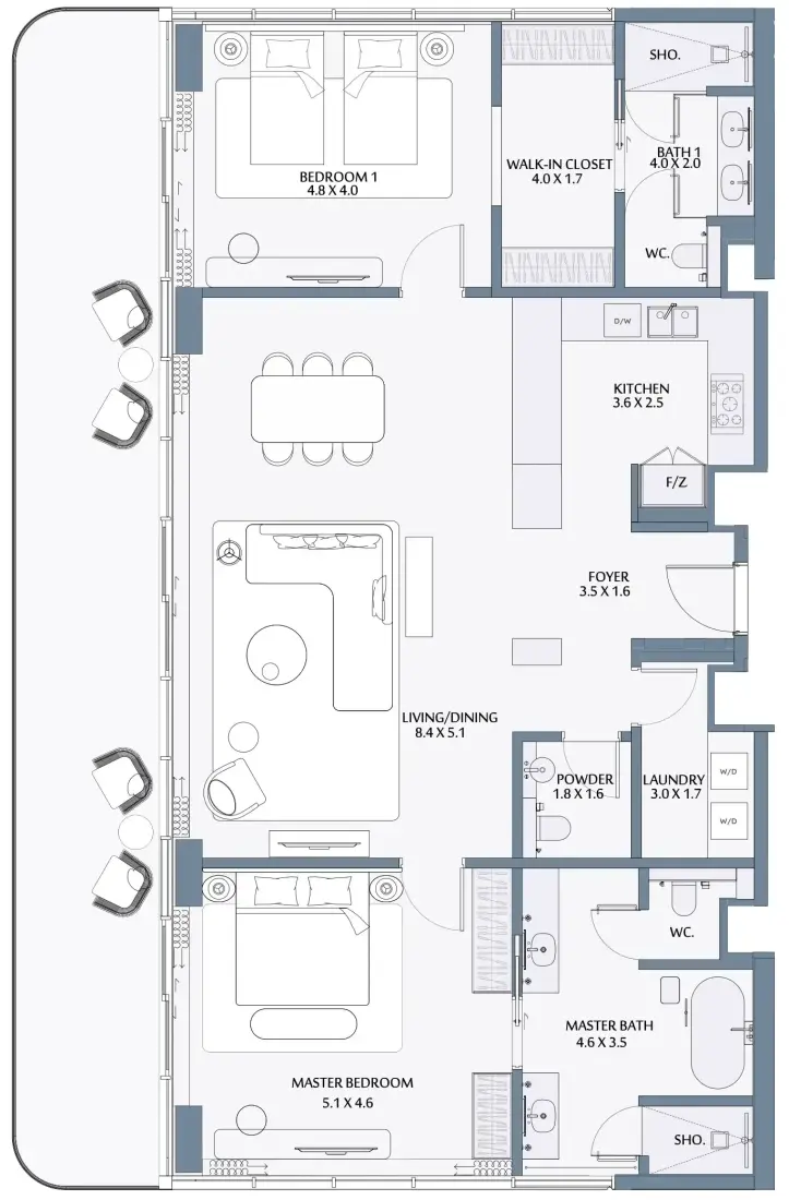 Where azure waters merge with thoughtful design, the villas represent a blueprint for waterfront living. The cascading architecture emerges against the Arabian sky, every level revealing new perspectives of the endless horizon through sweeping glass walls and expansive terraces. Each three, four, and five-bedroom villa opens onto a sheltered garden with its own infinity pool and individual boat dock.