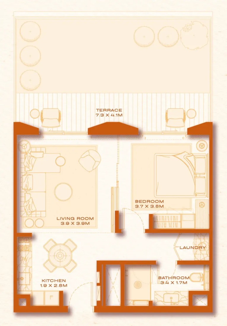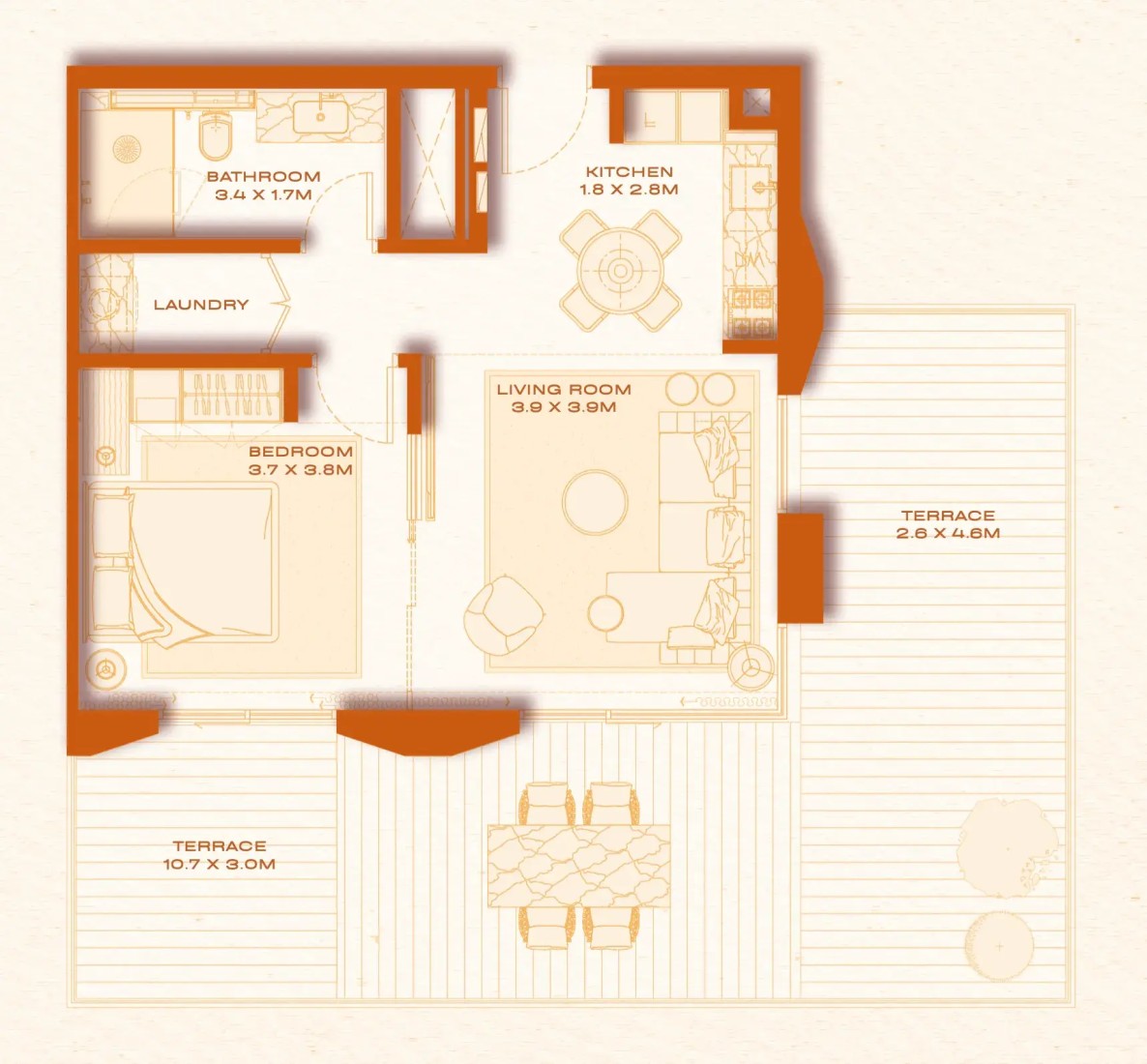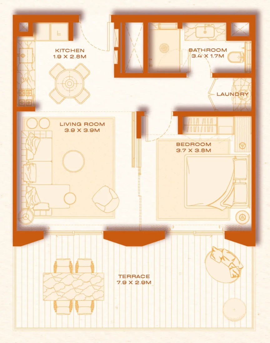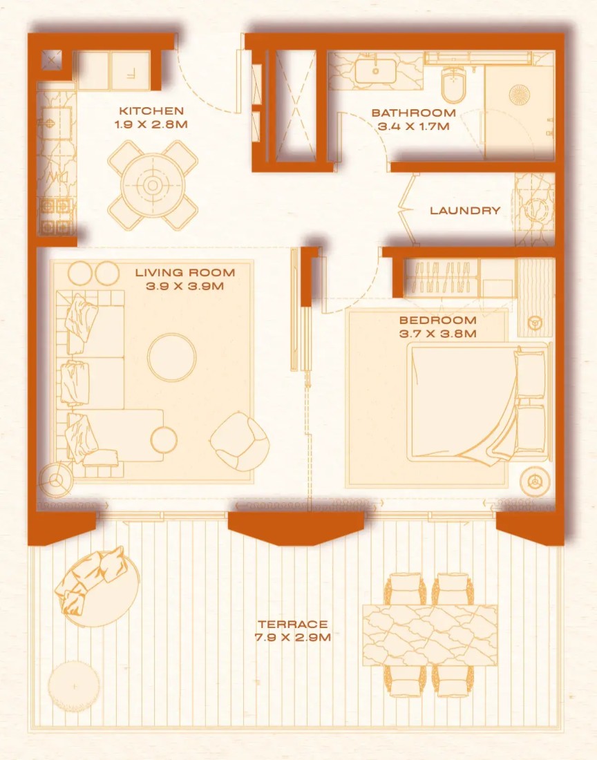 Interiors are finished with modern, high-quality materials and a clean, contemporary aesthetic. Apartments feature well-designed layouts with refined flooring, elegant wall finishes, and large windows that enhance natural light. Kitchens are fully fitted with quality cabinetry, durable countertops, and integrated appliances, while the residences are delivered semi-furnished, providing essential built-in elements that allow residents to personalize their living space.