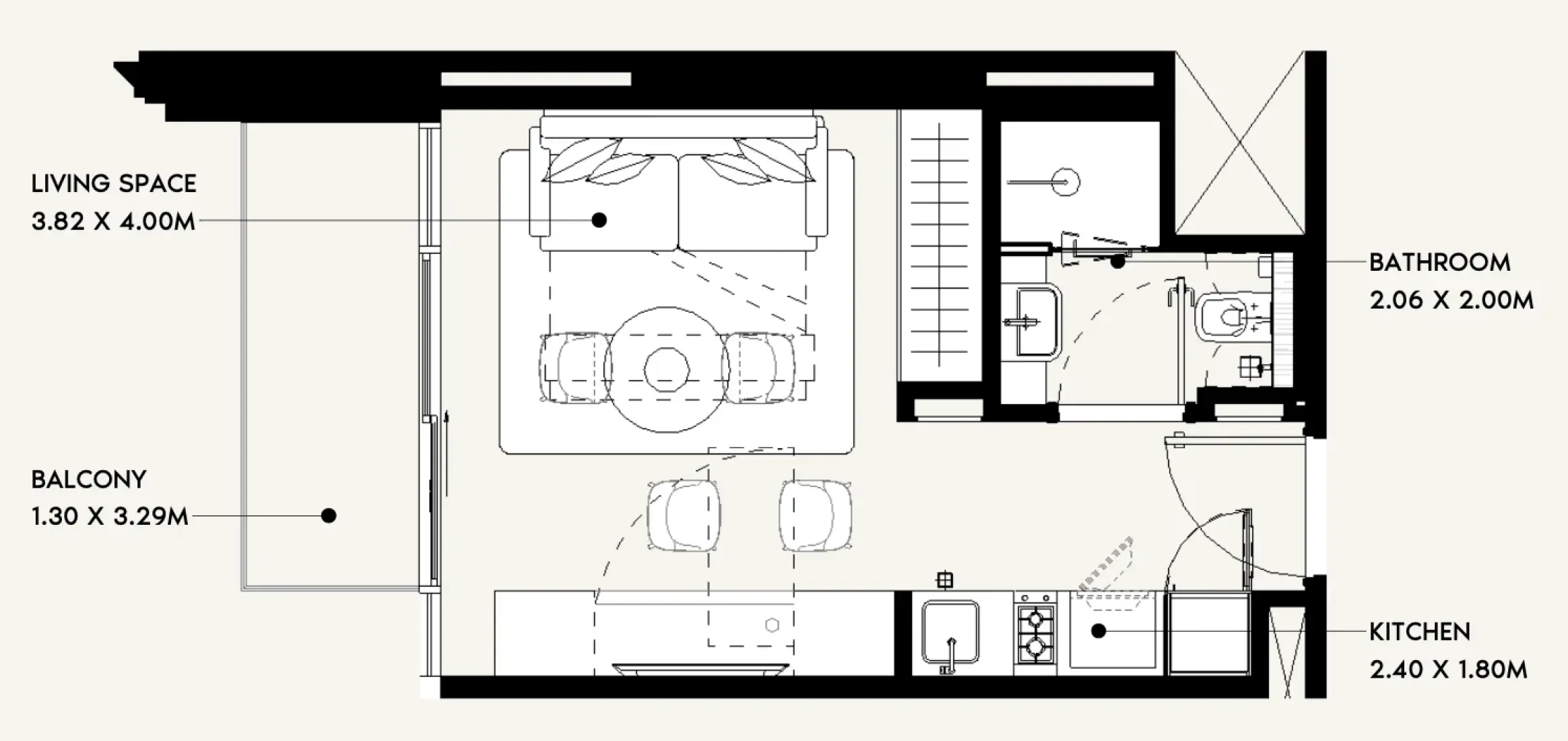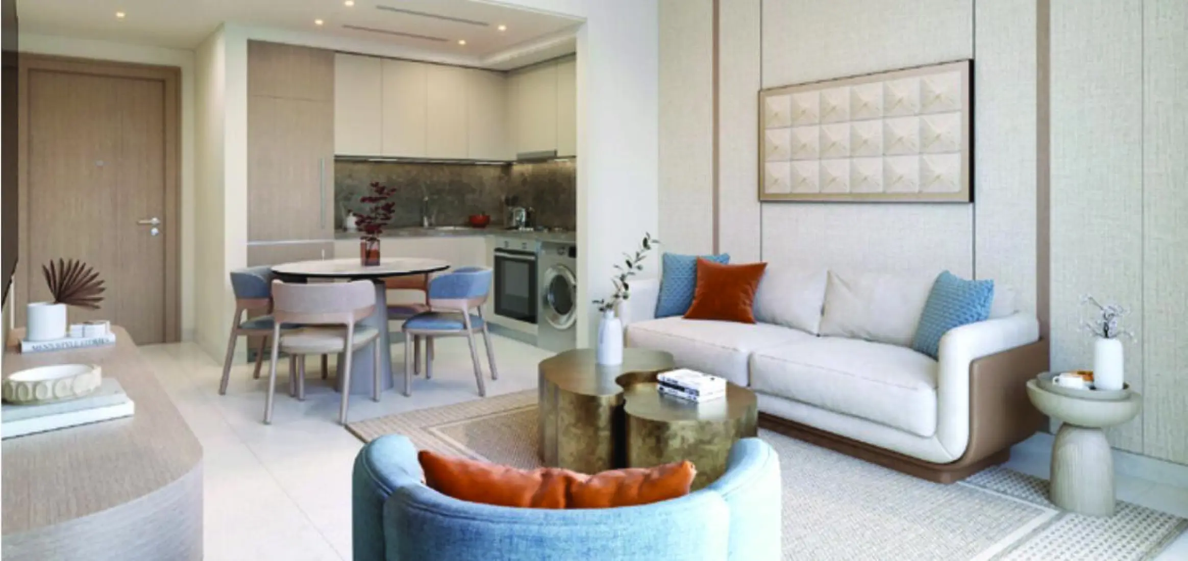 The Jaddaf Beach Oasis residences feature a modern, resort-inspired interior design characterized by a natural color palette and high-quality, durable materials that maximize a "beachside" aesthetic. These fully furnished apartments are crafted with open-concept layouts, floor-to-ceiling windows to flood spaces with natural light, and premium finishes like elegant countertops and contemporary spa-like bathroom fixtures. Every unit includes a fully equipped kitchen with high-end appliances and functional storage solutions, while living areas are thoughtfully arranged with stylish furniture and built-in wardrobes to create a seamless, move-in-ready urban retreat.