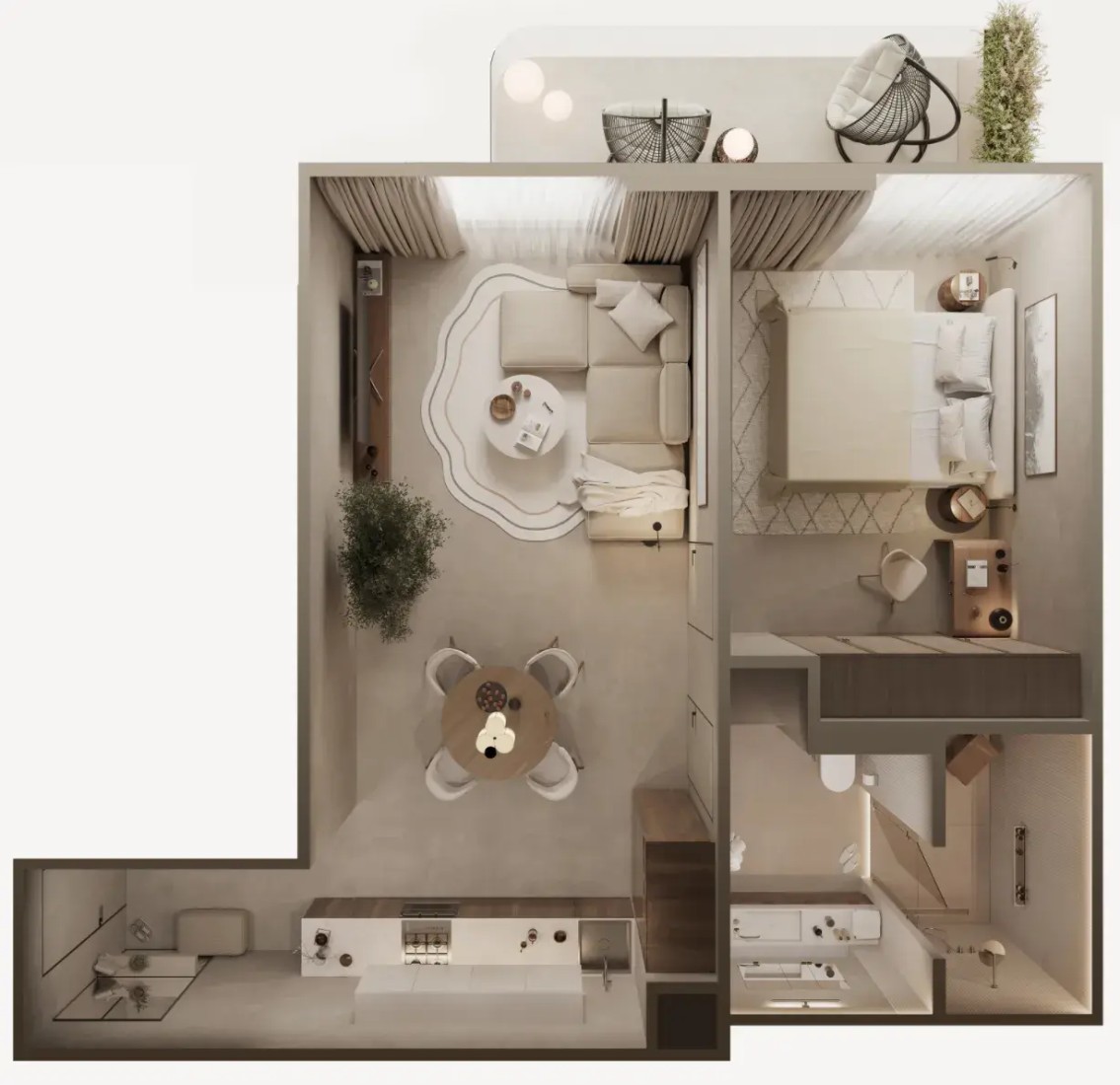 - Maximum-sized kitchen and living room; - Master bedroom with built-in wardrobe and private bathroom; - All include terraces; - Strict separation of public and private area.