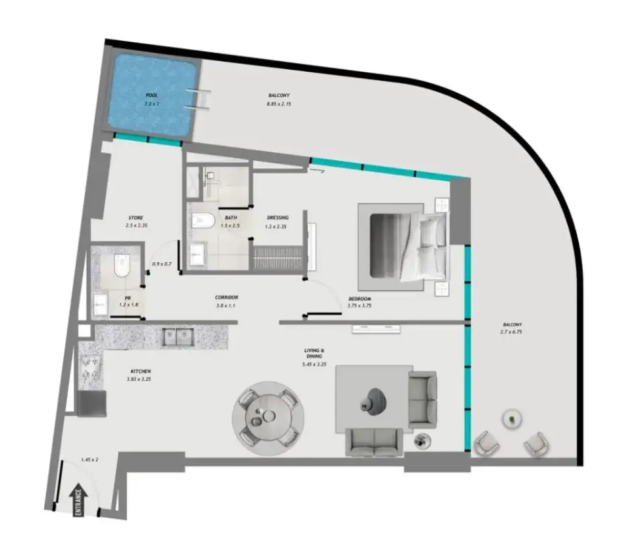 SAMANA Resorts provides Studios, 1- and 2-bedroom apartments with private pools on the balcony. All units include built-in kitchen appliances.