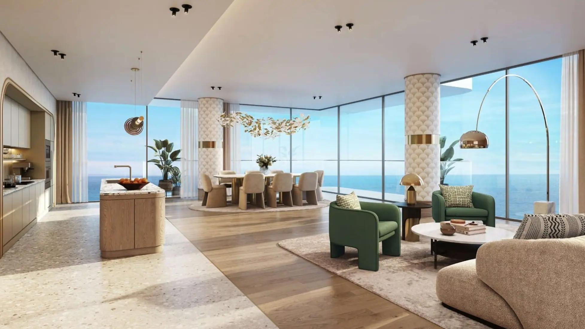 Soft, flowing contours, wave-like balconies, and glass balustrades create a dynamic yet seamless connection between Sensia and its surroundings. Designed to frame breathtaking views, each architectural curve welcomes fresh ocean breezes, while the elevated podium enhances the structure’s grandeur. Coastal-inspired design principles infuse Sensia with a sense of connection to the sea, offering expansive panoramas of the ocean, the serene Bay, and the iconic Dubai skyline.