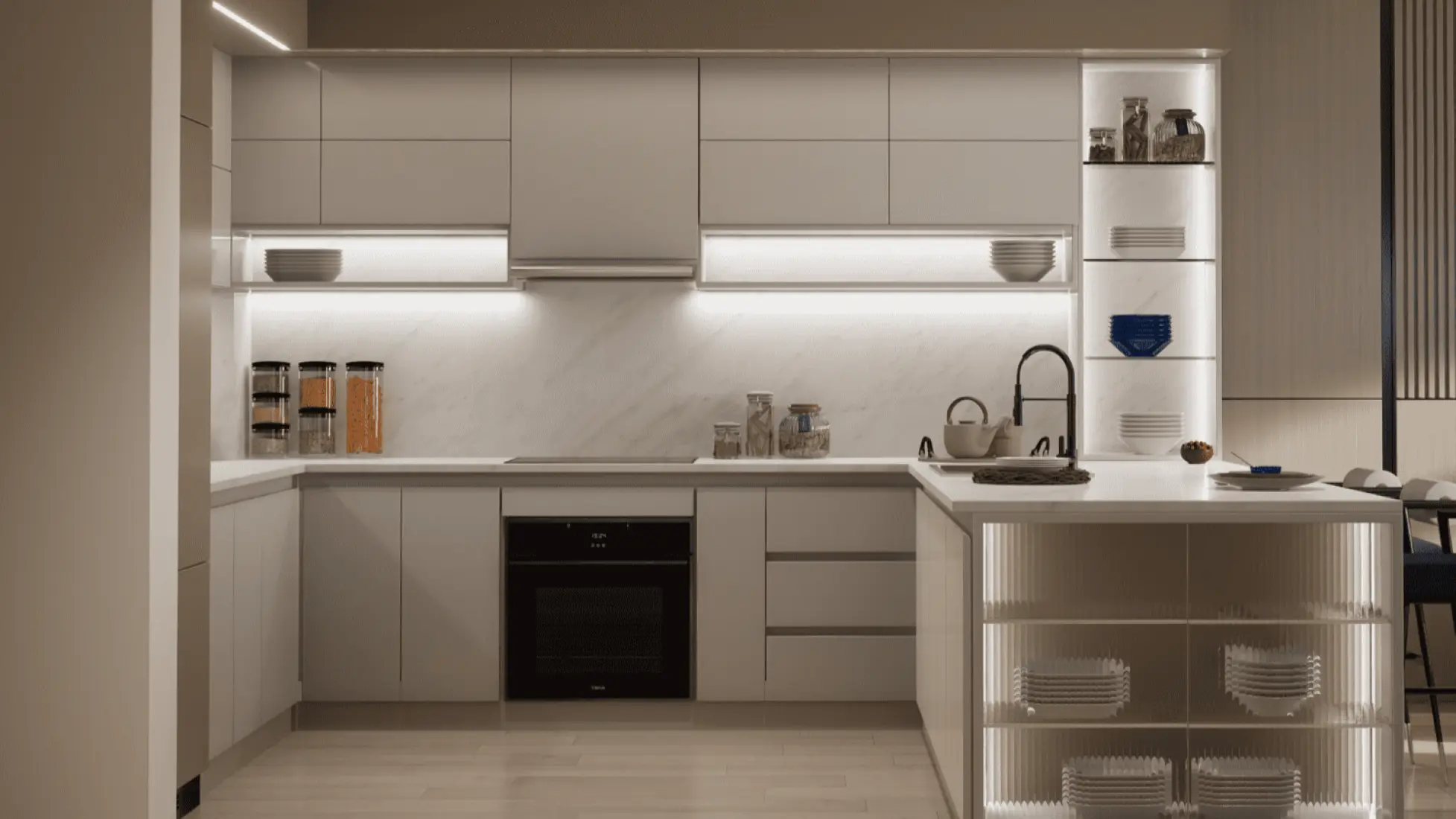 The lavish materials and uncompromised finishing throughout the building depict supreme quality and craftsmanship from only the most distinguished of international suppliers. All the fittings and fixtures within the apartments are handpicked to perfectly compliment the interior design. The sliding glass doors and windows create a perfect balance between interior and exterior spaces while maintaining the highest level of environmental control and functionality.