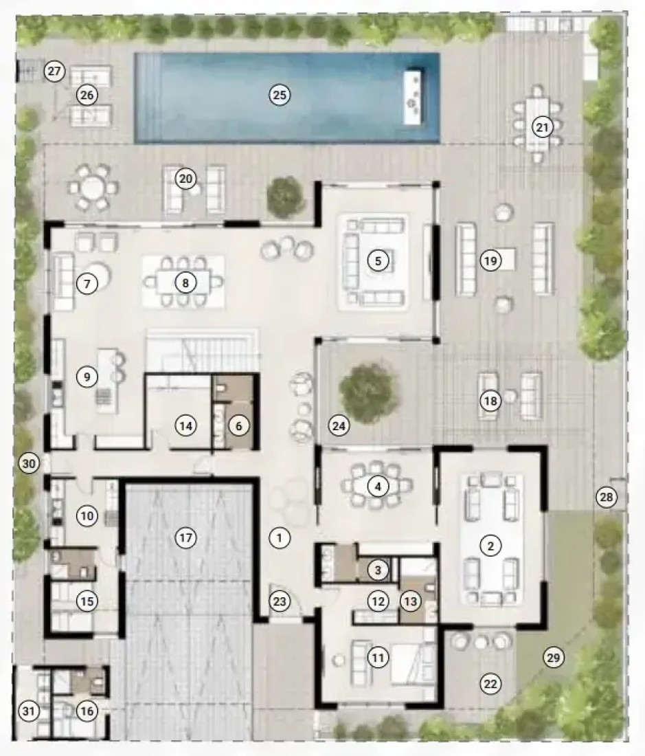 Clean lines and a minimalist aesthetic define this mansion, featuring lavish travertine surfaces on the façade and contemporary dark brass screen details. These elements serve not only as decor but also as functional shading, creating a symphony of style and comfort. The outdoor spaces are designed to enable intimate social gatherings, offering versatile areas to share moments with friends and family, all while immersed in the serenity of the outdoors.