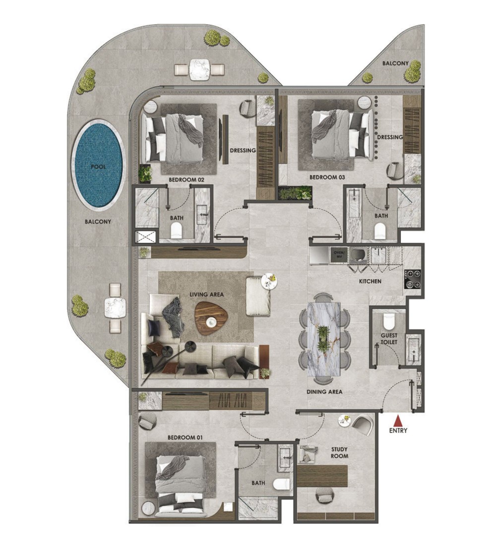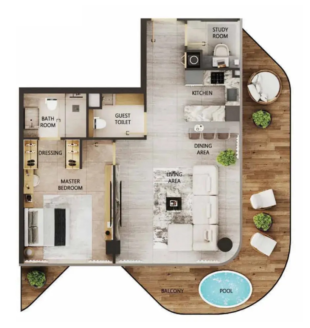 Each apartment within Arya Residences is fully furnished with bespoke designer pieces and thoughtfully curated interiors. With unit types ranging from one-bedroom apartments to five-bedroom duplex penthouses, the homes feature sky pools, personal assistant robots, and advanced smart home technology. Premium finishes reflect a commitment to both luxury and ease of living. These residences are not only elegant but truly intelligent, designed for a lifestyle of effortless comfort. Modern finishing with high-quality materials. Smart Home Technology.