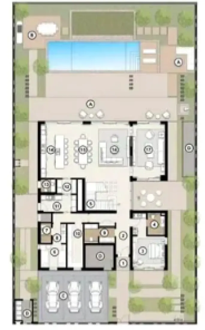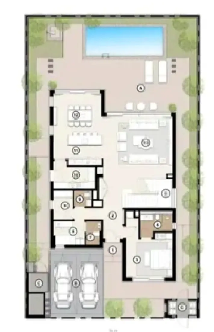 Villas and residences are specified to premium waterfront standards: spacious open-plan layouts with large floor-to-ceiling glazing to maximise sea/skyline views, designer kitchens with premium cabinetry and stone worktops, marble/porcelain and engineered-stone finishes in bathrooms, built-in wardrobes and bespoke joinery, high-quality fixtures and branded sanitaryware, and luxurious outdoor terraces/private pools (for villas). Communal areas and amenities (clubhouse, rooftop infinity pool, landscaped parks, promenades, sport courts and marina-edge finishes) are finished to resort-grade levels consistent with Modon’s ultra-premium offering.