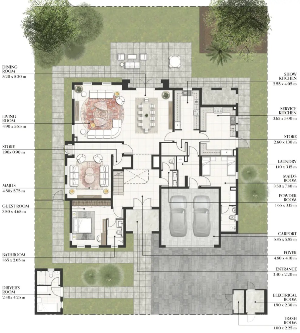 The luxury villas at Almeria offer two interior finish options: the default Premium finish, featuring designer porcelain tiles, bespoke mosaics, and sustainable materials, and the Upgrade finish, which gives you the opportunity to choose the finish yourself, and which adds sophisticated touches like polished marble, hardwood flooring, and brass hardware for a more refined, personalized ambiance.