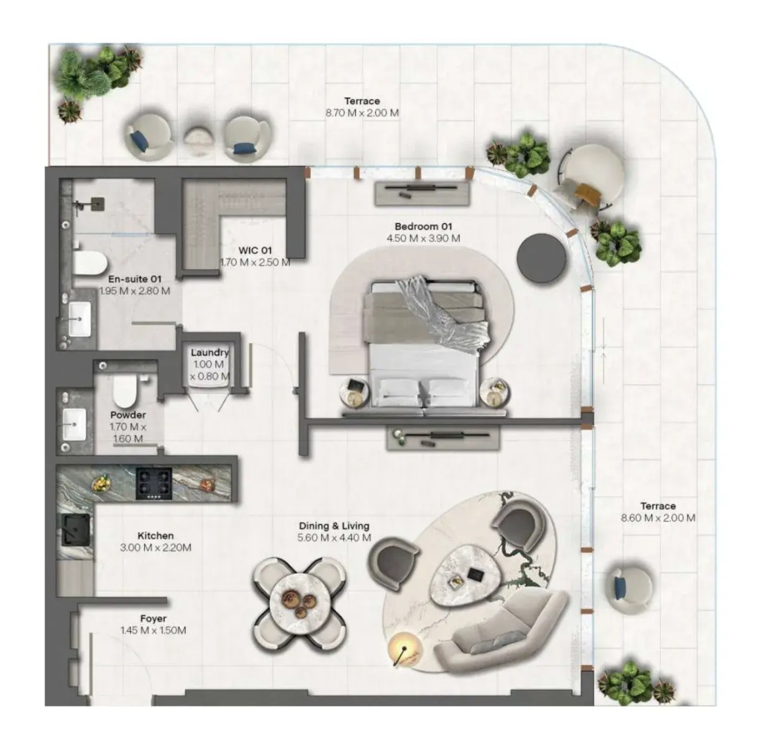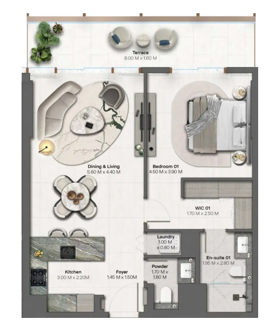 Interiors at Hado are defined by elemental, nature-inspired materials and a calm, contemporary aesthetic influenced by Japanese principles of simplicity and harmony. Finishes feature a refined palette of stone, warm timber, brushed metal accents, and soft textured surfaces, complemented by generous floor-to-ceiling heights and abundant natural light. Kitchens are crafted as sculptural spaces with stone countertops, timber cabinetry, and subtle metal detailing, designed for both functionality and quiet elegance. The residences are delivered unfurnished, allowing owners to personalize their homes while enjoying a high level of material quality, craftsmanship, and timeless design throughout.
