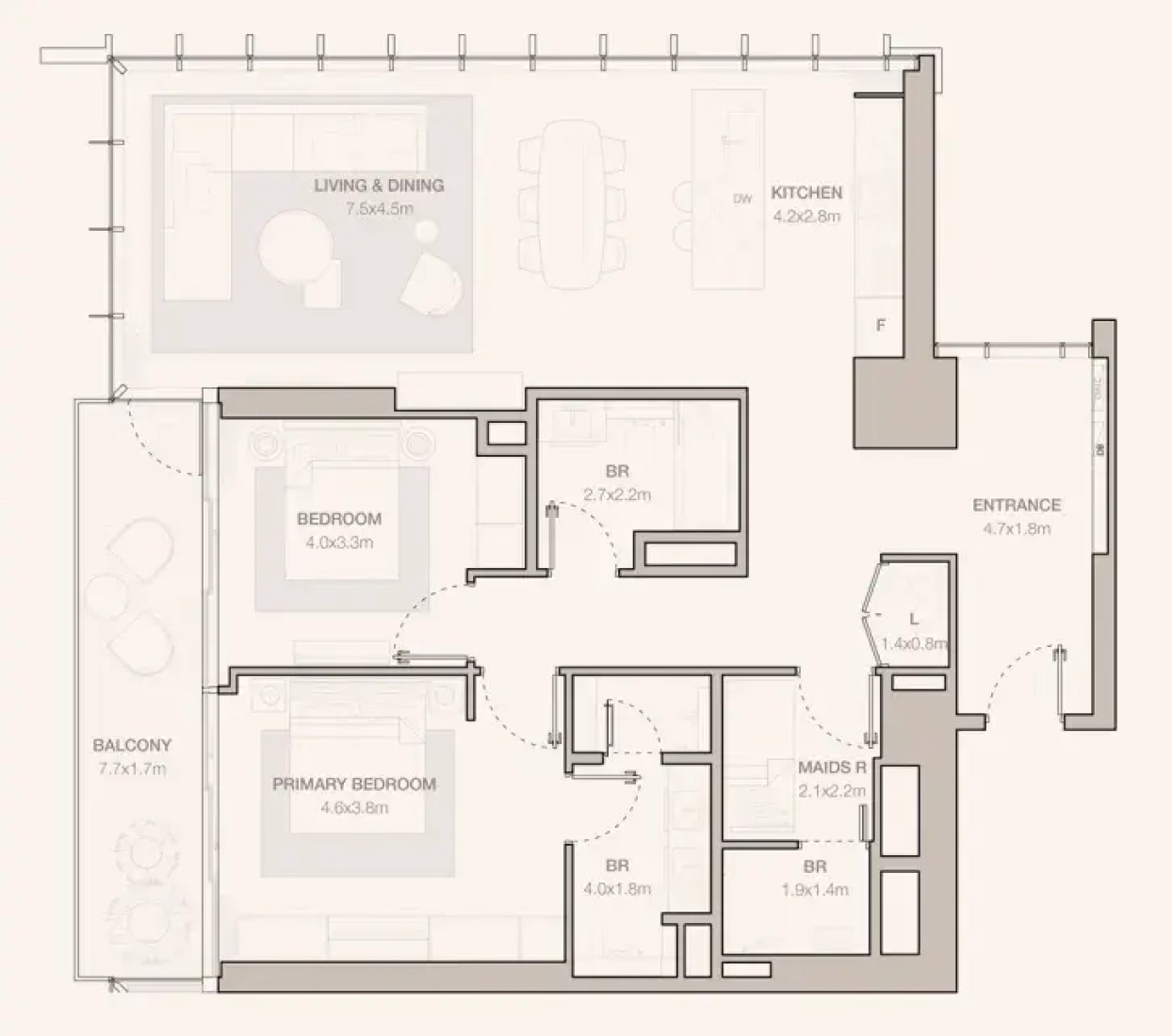Inside, each residence is a curated masterpiece of spatial harmony and refined detail. The interiors feature a warm, elegant palette of natural materials — caramel tones, wood accents, fluted glass, and soft marble — blending form with function. Open-plan layouts, expansive windows, and column-free spaces create fluidity and openness, offering an atmosphere of quiet luxury in every room. From bespoke kitchens to spa-like bathrooms, every element reflects a deep commitment to design excellence.