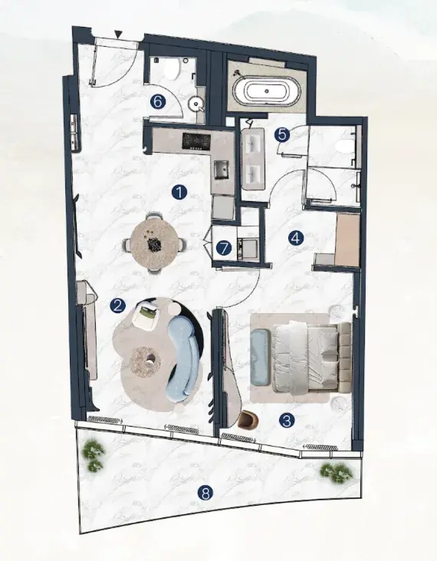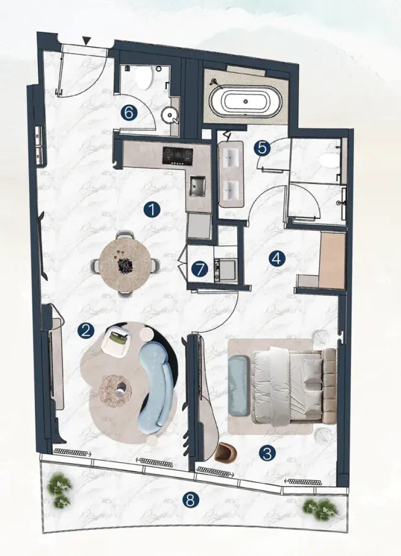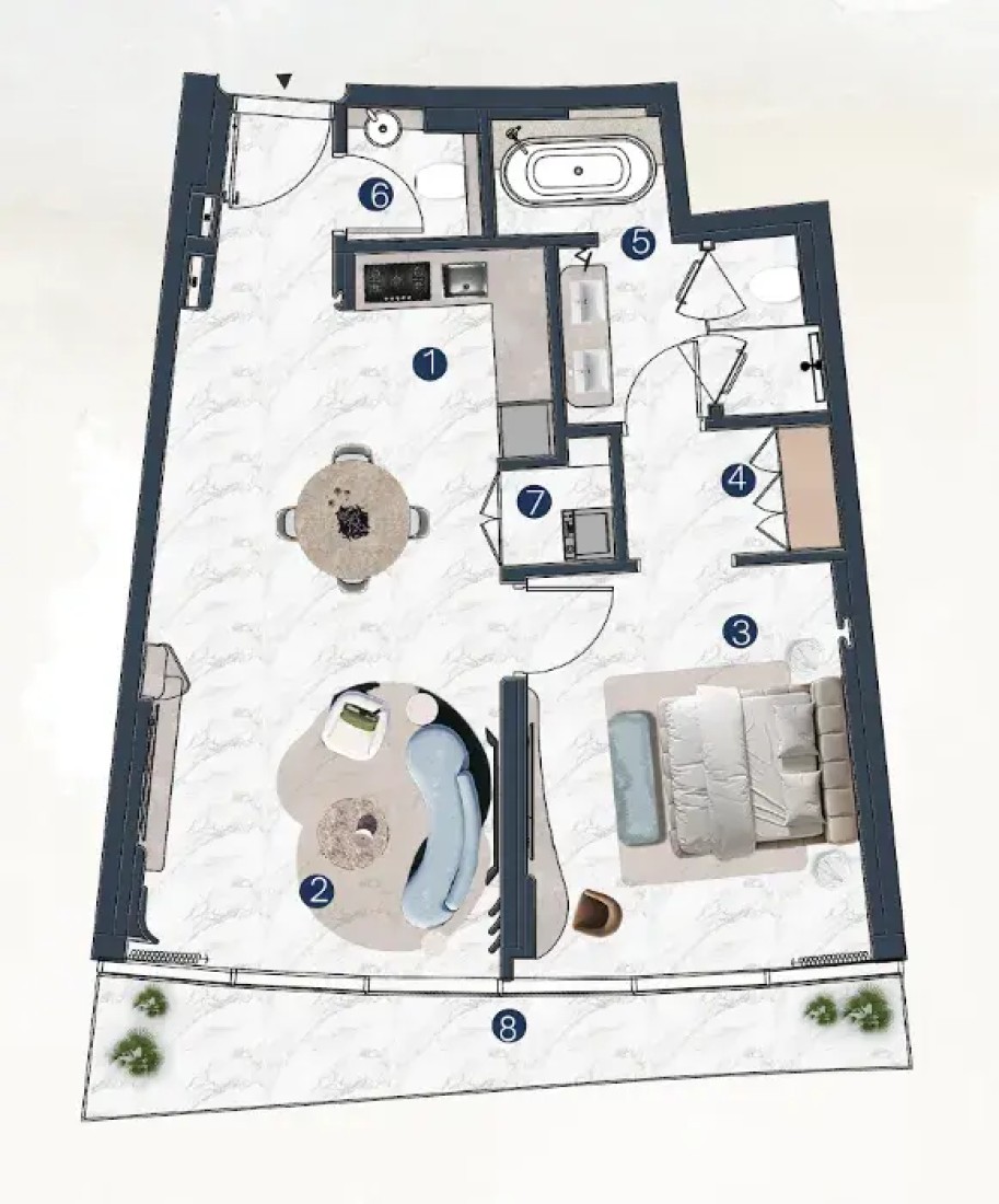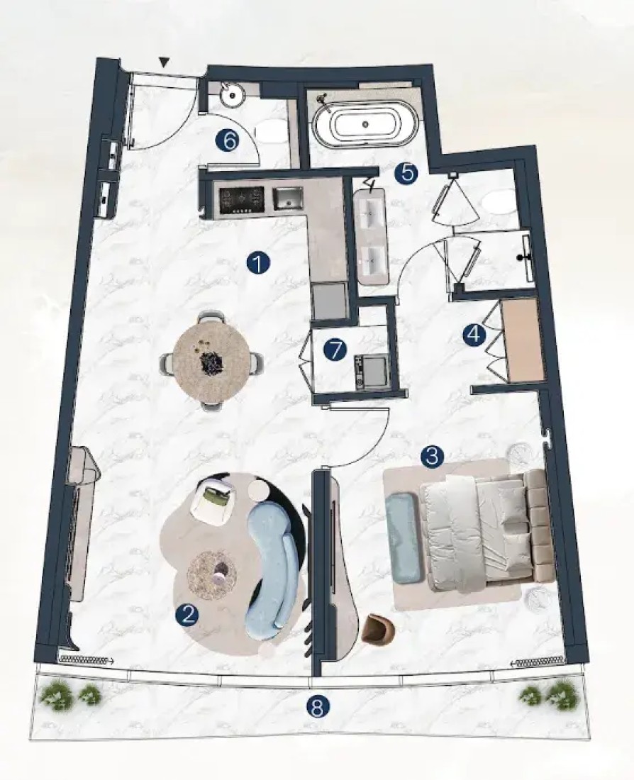 Experience the perfect balance of simplicity and sophistication in La Mazzoni's fully furnished bedrooms. Every inch of space is thoughtfully designed to create an intimate yet functional atmosphere, where luxury furniture and regional influences blend perfectly. The seamless kitchen design, with integrated appliances and a functional island with built-in seating, flows effortlessly into the living space, creating a sense of harmony. The bedroom is a serene retreat, offering tranquility and understated luxury in this elegantly crafted home.