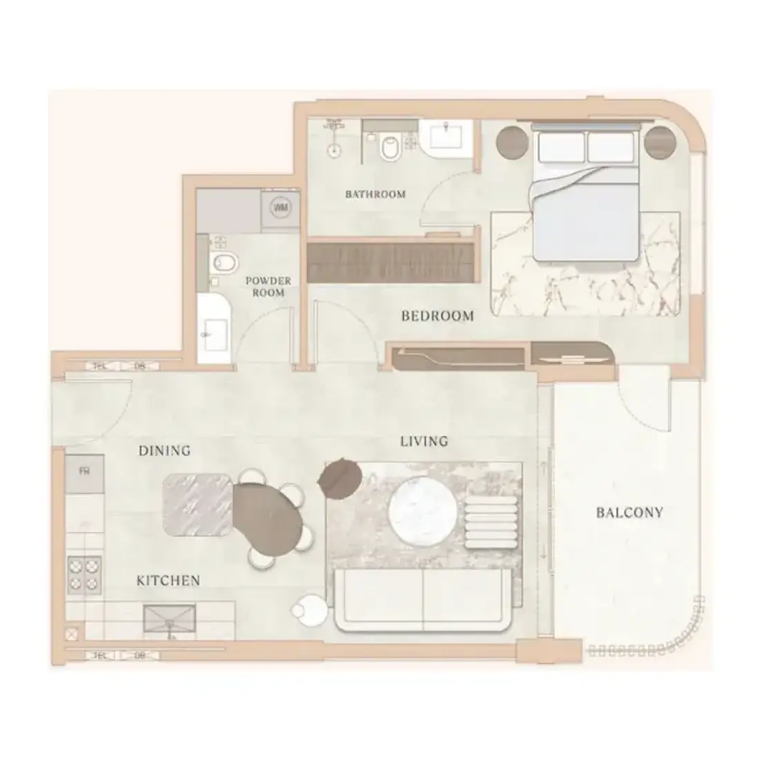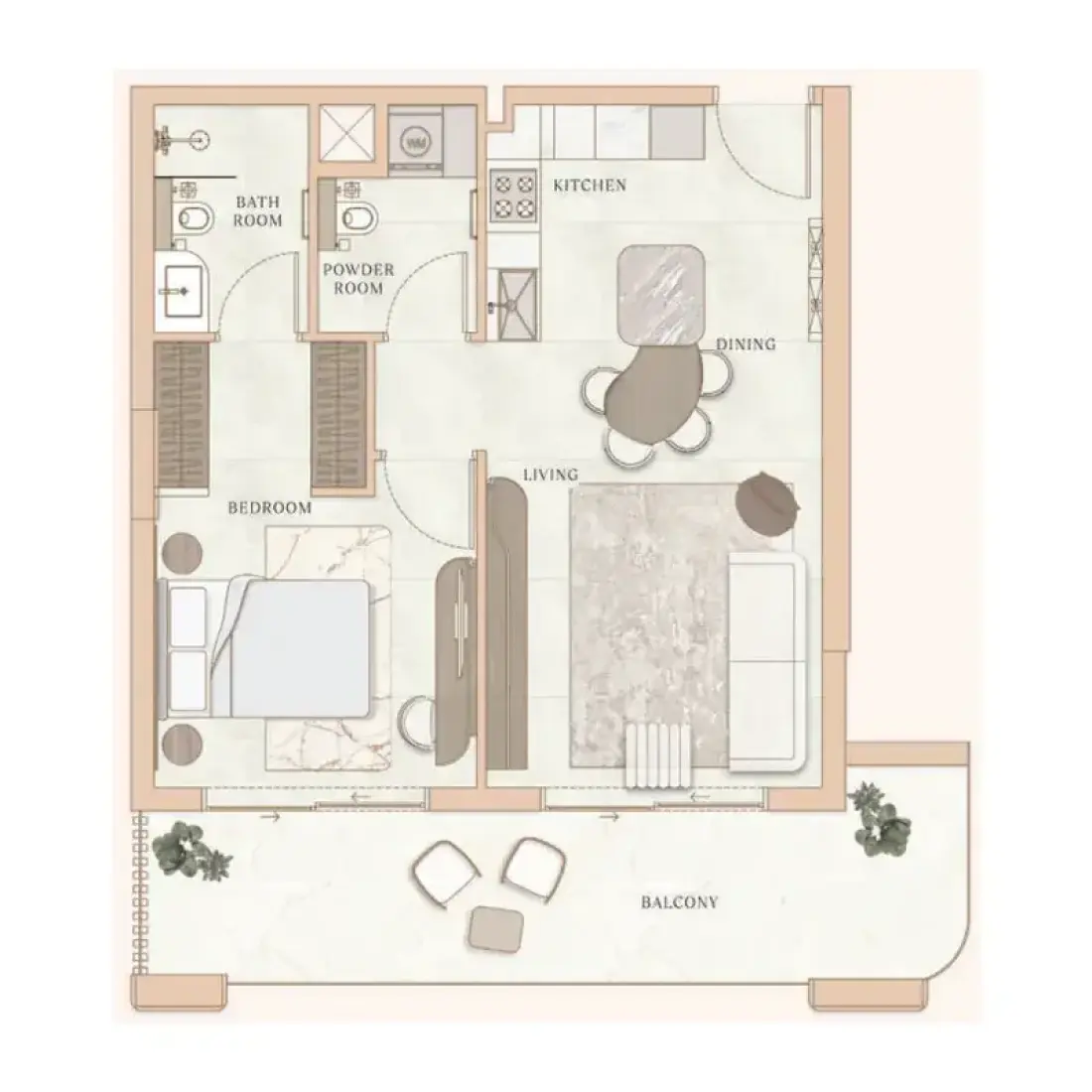 La Vue rises gracefully amidst lush surroundings, its contemporary façade embodying refined elegance. Expansive balconies and floor-to-ceiling windows capture sweeping views of Dubai’s iconic landmarks and the evolving skyline.