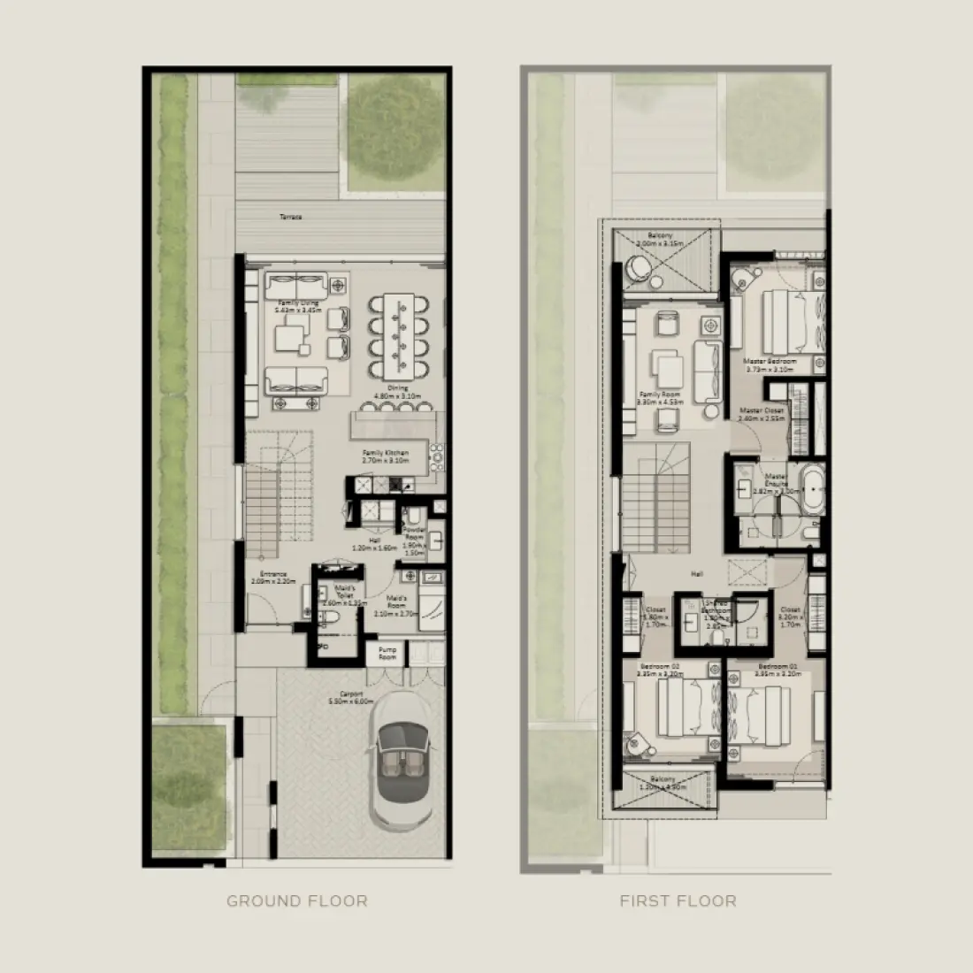 Modern finishing with high-quality materials. Luxurious townhouses with sleek exteriors featuring clean lines, articulated masses, bronze aluminum screens, and wide glass windows, they offer a sophisticated aesthetic while ensuring bright, inviting interiors with expansive double-height ceilings. The villas’ contemporary architecture, defined by the use of stone and aluminum screens, conveys a sense of luxury and sophistication while enhancing its overall aesthetic.