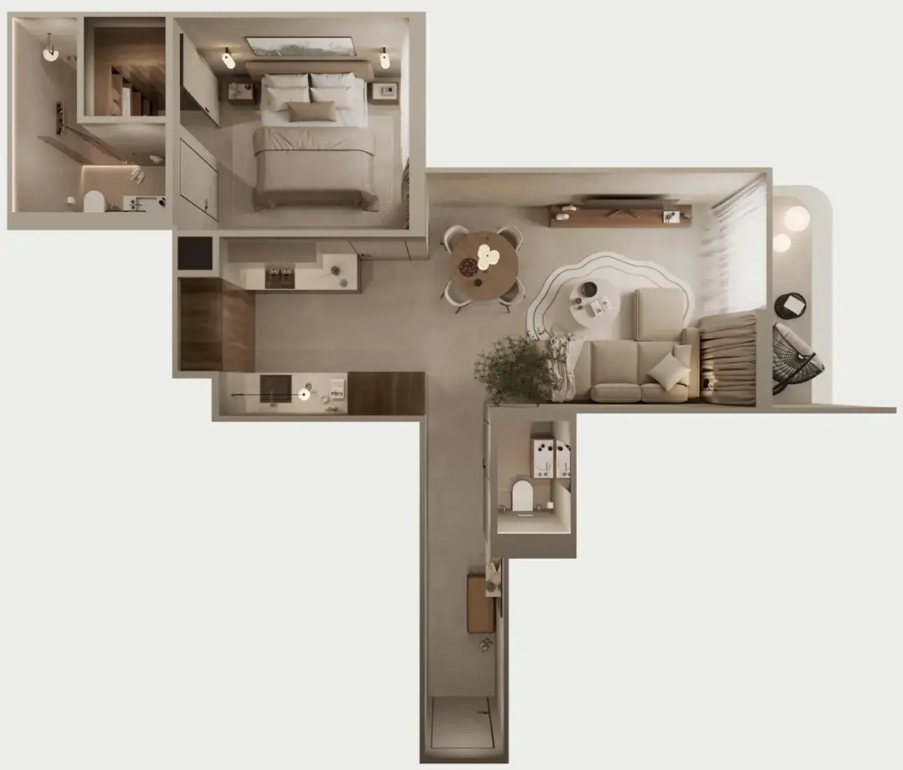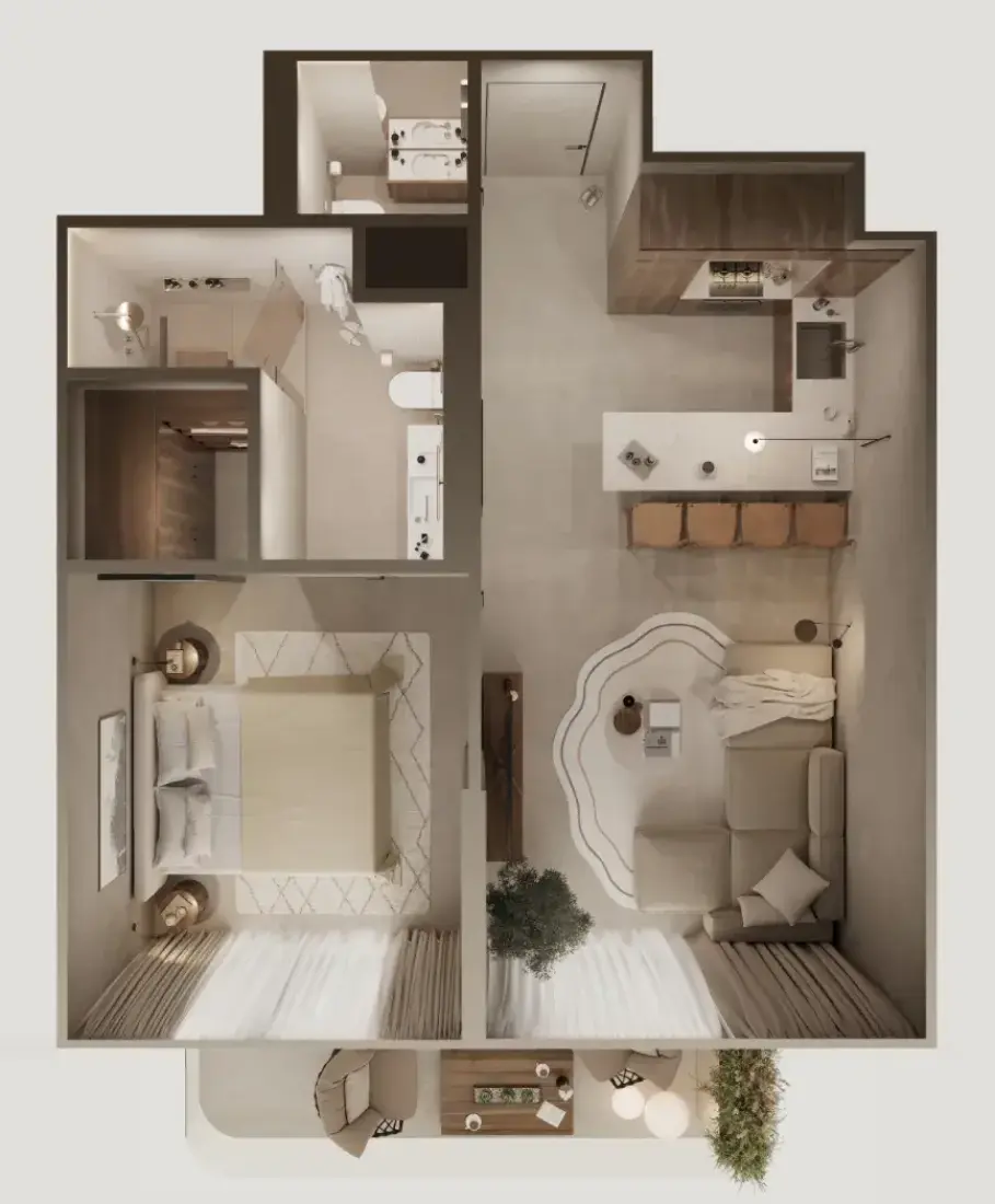- Maximum-sized kitchen and living room; - Master bedroom with built-in wardrobe and private bathroom; - All include terraces; - Strict separation of public and private area.