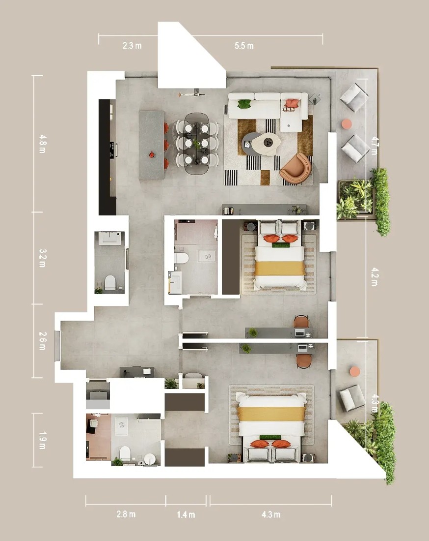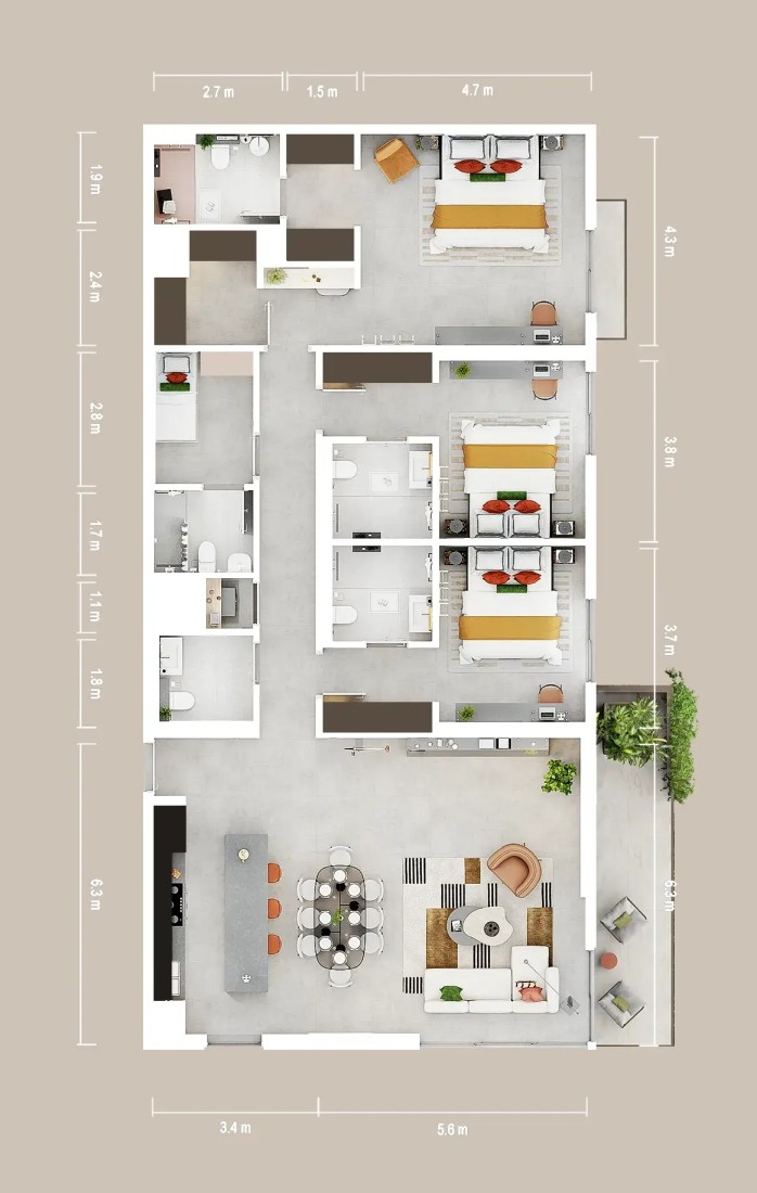 The residences include 1, 2, and 3-bedroom apartments, thoughtfully planned to suit different lifestyles. Interiors are stylish yet functional, built to support active and balanced living. Expansive windows and open layouts create bright, airy homes where comfort and modern design meet seamlessly.