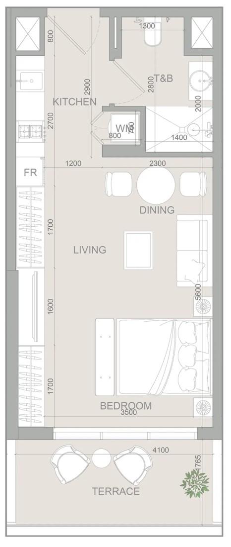 The project features a modern architectural structure comprising studio, 1, 1