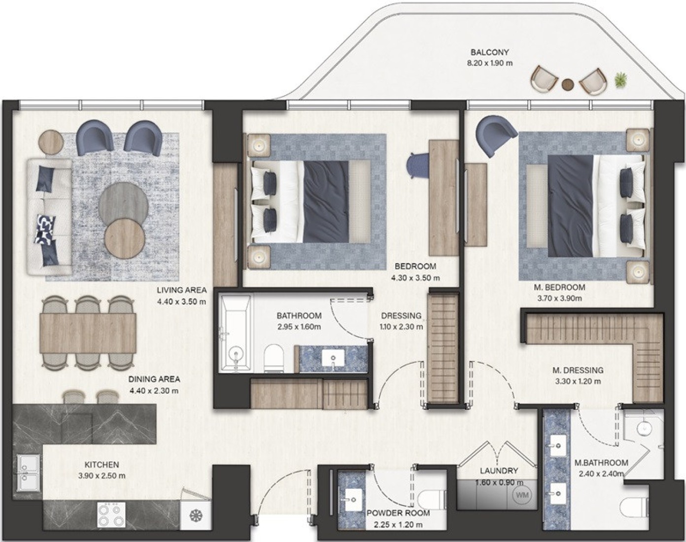 Seamont’s residences are specified to premium, hotel-grade standards consistent with a Marriott Autograph Collection partnership: neutral, coastal palettes with full-height glazing for panoramic sea views; bespoke joinery and built-in wardrobes; designer kitchens with premium cabinetry and stone worktops; premium sanitaryware and marble/porcelain finishes in bathrooms; engineered/porcelain flooring in living areas; and high-quality materials and finishes in lobbies and amenity spaces (spa, gym, infinity pools, concierge areas) to match branded-residence hospitality expectations.