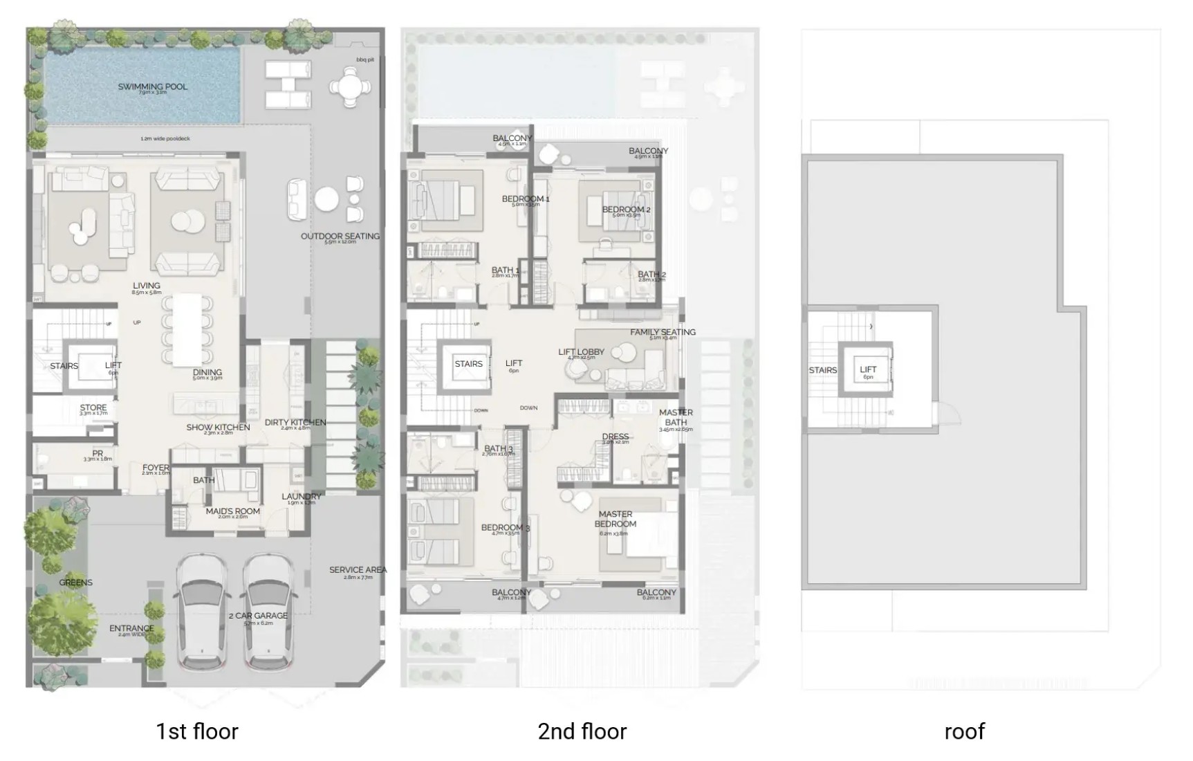 The interiors of each estate home are designed to evoke calm and warmth, using soft, earthy tones and open, light-filled layouts. Skylights, family lounges, private garages, and maid’s rooms contribute to the functionality and comfort of each residence. Select homes also feature private elevators, rooftop terraces with canopies, and built-in BBQ areas—offering elevated spaces perfect for entertaining or simply relaxing in style.